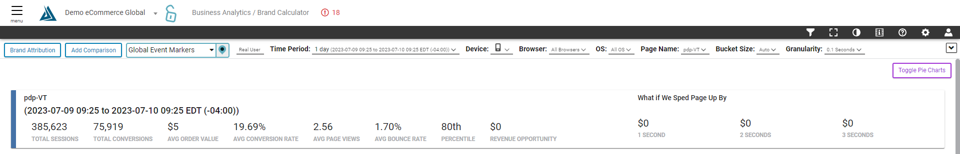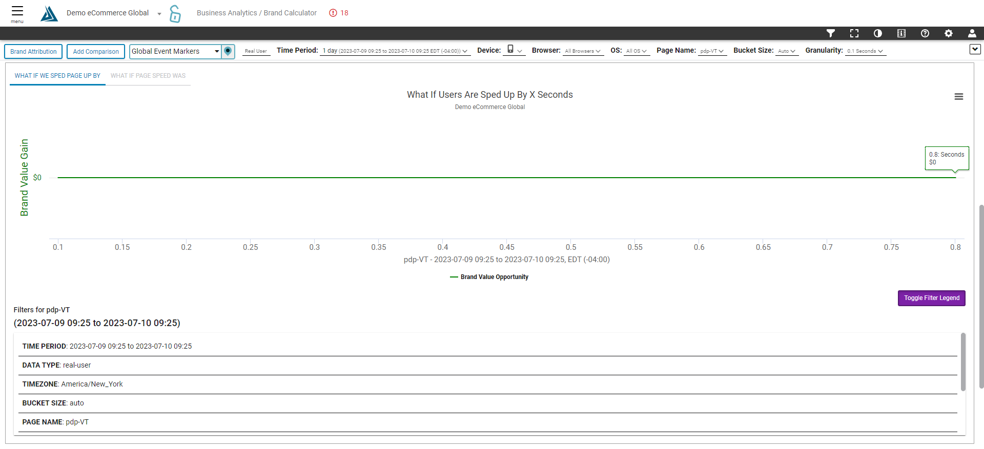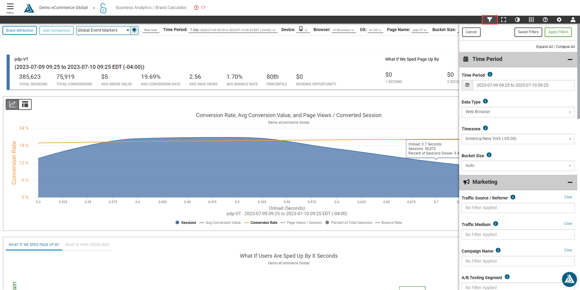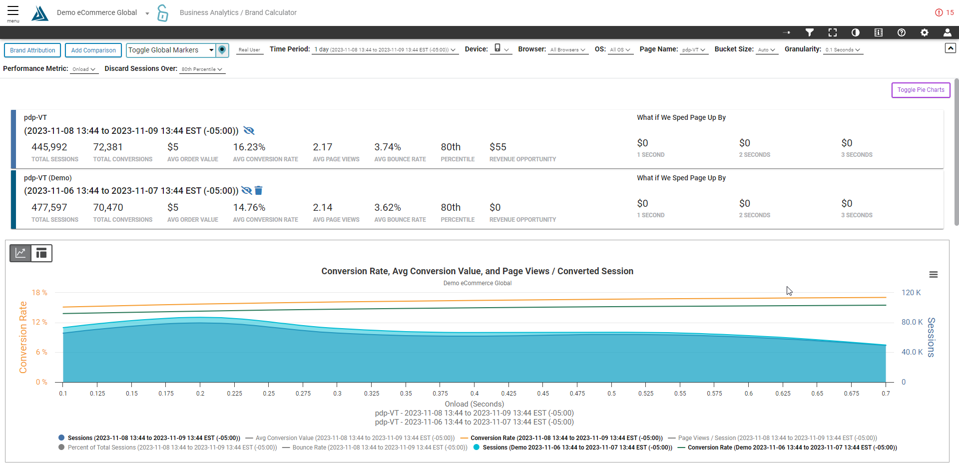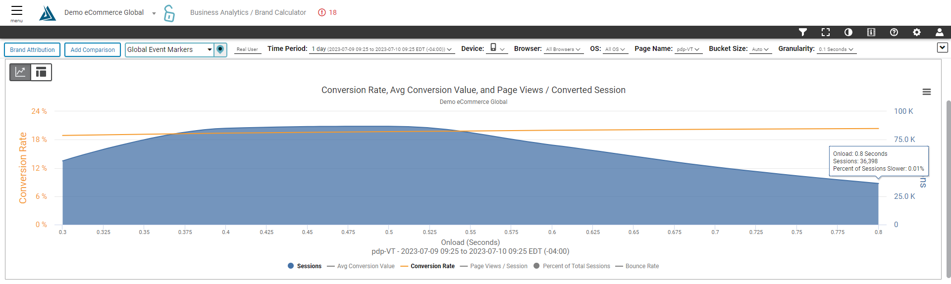 The Brand Calculator page accurately predicts the impact that changes in page load time will have on brand value for every web page. It also visualizes the impact page load time has on various business KPIs (Conversion Rate, Sessions, Average Order Value, Page Views / Sessions, Bounce Rate).