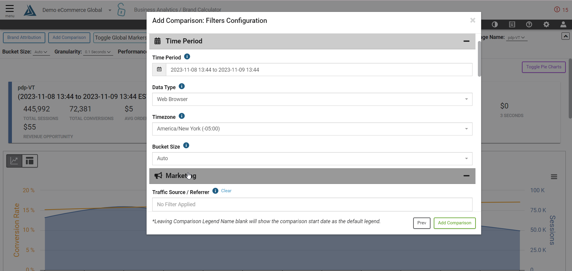 Choose a time period to compare to, name the comparison, and choose which configurations to include. Click Next.